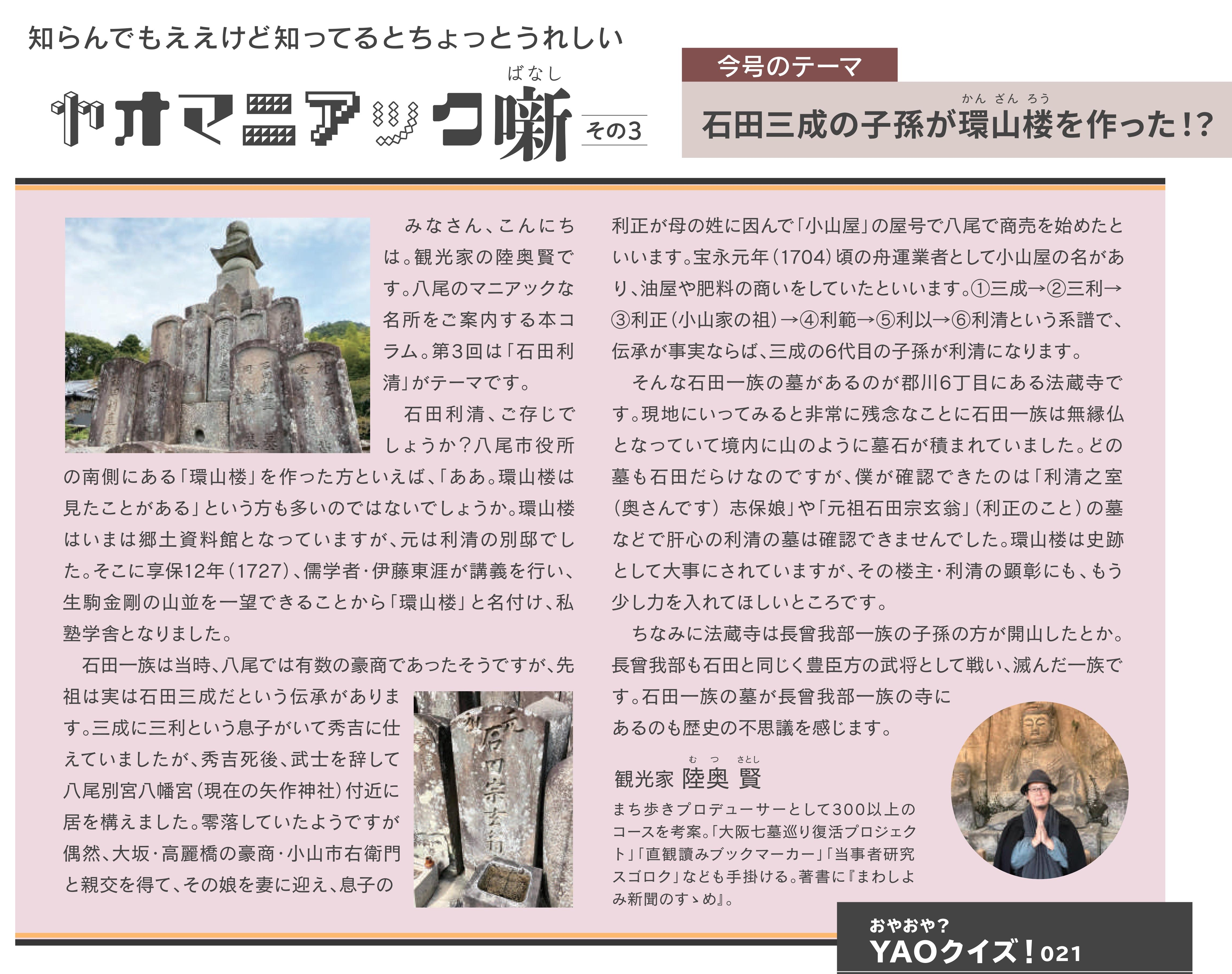 ちょっと前に知ったんですが八尾市観光協会さんが解散したそうで発行していた八尾の観光情報誌『yaomania』のバックナンバーもすべてネット上から消滅しました。